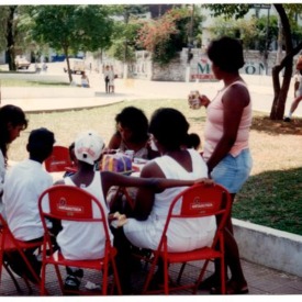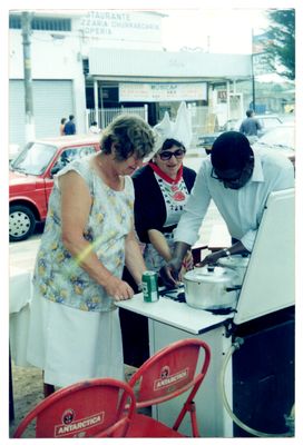 12ª Feira de Comidas Típicas organizada pelo Centro de Direitos Humanos Carlos Alberto Pazzini. Dona Maria Velcic, à direita; e seu Sebastião, à esquerda. Local da foto: Praça Inácia Dias.