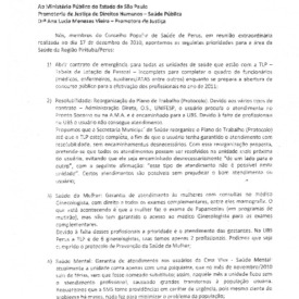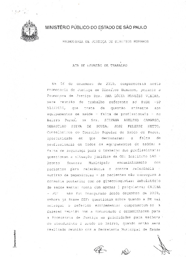 Ata de reunião da Promotoria de Justiça de Direitos Humanos com conselheiros do Conselho Popular de Saúde sobre a situação do Pronto Socorro de Perus.