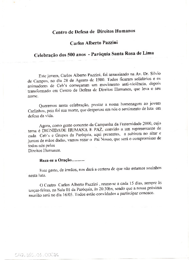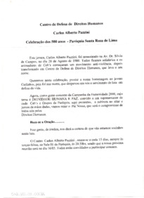 Roteiro de homenagem a Carlos Alberto Pazzini, que dá nome ao Centro de Direitos Humanos. Comenta o surgimento do Centro e convida para a participação, indicando a frequência e local das reuniões. A homenagem faz parte da Campanha da Fraternidade em 2000.