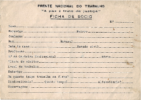 Ficha não preenchida para filiação na Frente Nacional do Trabalho.