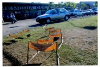 Imagem de gramado com pequenas faixas com poema de Carlos Drummond de Andrade. Ao fundo outra faixa: Memória dos Intereclesiais