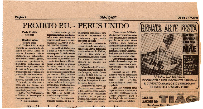 Texto sobre a organização da manifestação de maio de 1995 contra o Aterro. O movimento levou o nome de Projeto PU, reunindo diversas pessoas e organizações do bairro.
