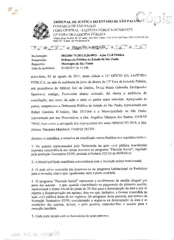 Termo de conciliação sobre ocupação de uma área ocupada há anos, mas não identificada nos documentos. Pressupõe a contrapartida de auxílio aluguel.