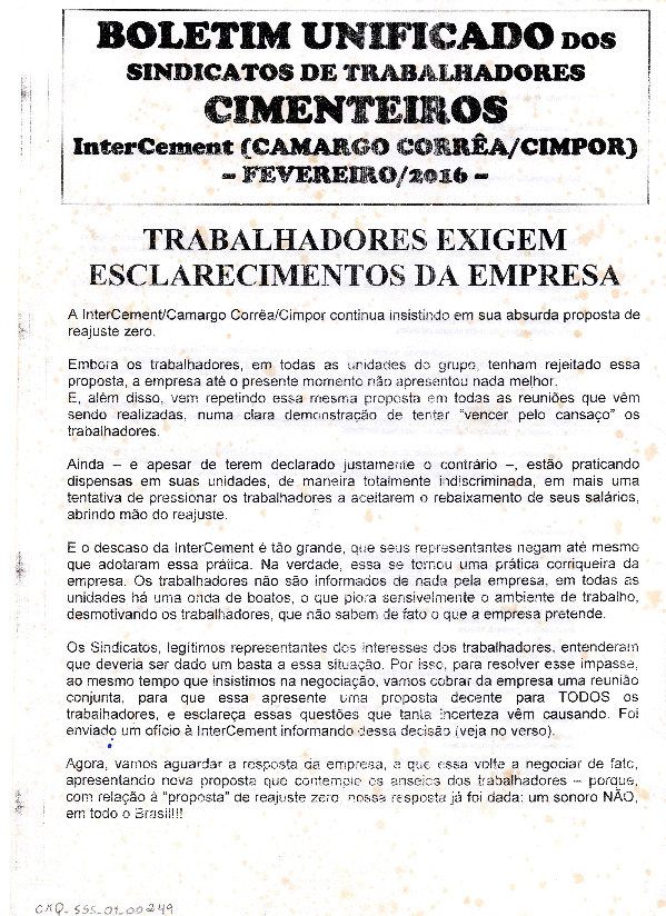 Boletim de sindicatos ligados a trabalhadores do cimento sobre negociação com a patronal. Informam que eles não querem negociar e também copiam carta que enviaram as patrões.